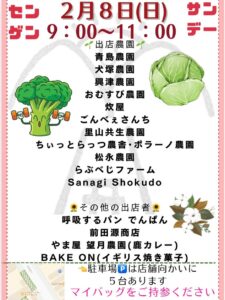 2月8日(日)のセンゲンサンデーは15店でお待ちしております お買い物にはマイバッグをお持ちください 🌱出店農園🌱青島農園犬塚農園興津農園おむすび農園炊屋ごんべぇさんち里山共生農園ちぃっとらっつ農舎・ポラーノ農園松永農園 […]