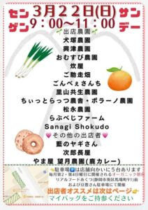 3月22日(日)のセンゲンサンデーは14店でお待ちしております時間は9時-11時お買い物にはマイバッグをお持ちください 🌱出店農園🌱犬塚農園興津農園おむすび農園炊屋ご馳走畑ごんべぇさんち里山共生農園ちぃっとらっつ農舎・ポ […]
